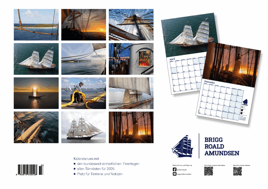 … der Kalender 2026 mit Motiv der Brigg ROALD AMUNDSEN für jeden Monat, plus Platz für Kalendernotizen, inklusive Törns und gesetzlichen Feiertagen in Deutschland. Format: aufgeklappt A3, gefaltet A4 quer. Preis: 15 Euro inklusive Versand in Deutschland (andere Länder etwa 18 Euro, je nach Zielland) || Bestellung: Schiffsbüro